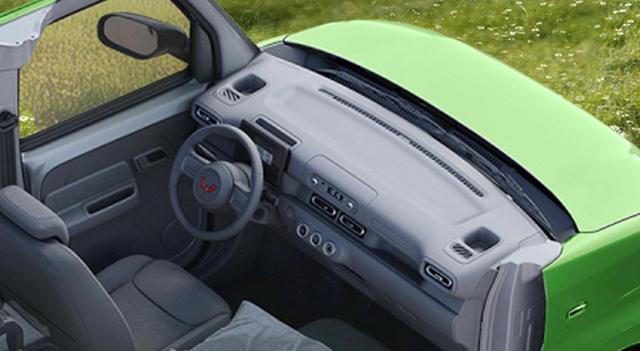 内饰部分,中控区域层次分明,配椭圆空调出风口设计,两辐方向盘前端为一块小尺寸显示屏。